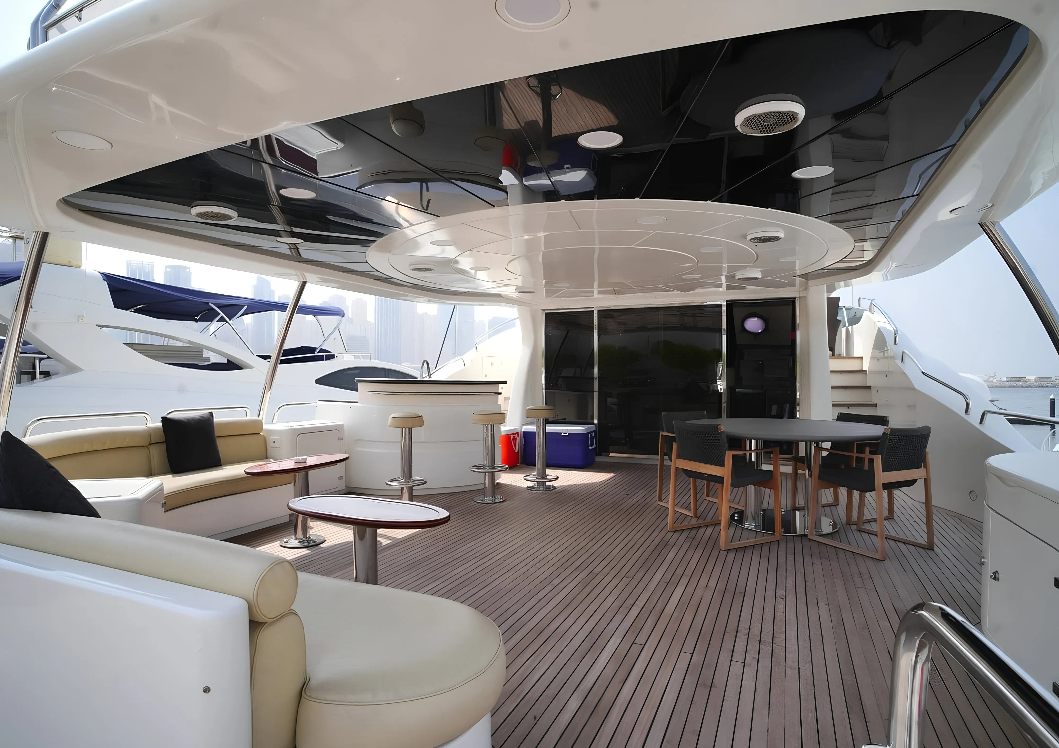 The flybridge is the ultimate space for entertaining, complete with a wet bar, lounge seating, and a Jacuzzi overlooking the horizon. For sun seekers, the foredeck boasts oversized sun pads and a private seating area, providing the perfect setting to enjoy the sun or take in the breathtaking views.