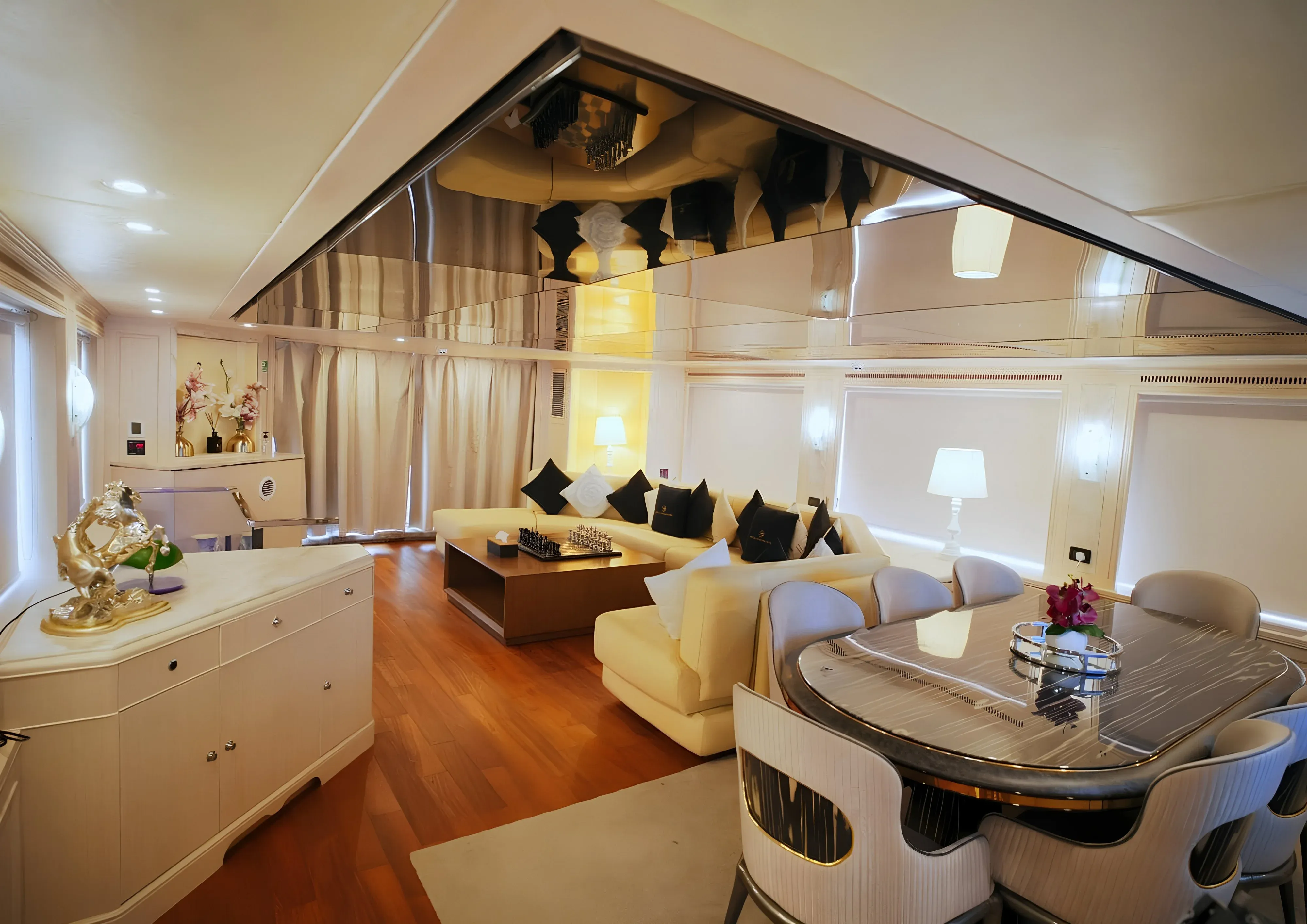 The main salon is a stunning display of modern design, featuring plush furnishings, a panoramic ocean view, and an advanced entertainment system. Adjacent to the salon is a formal dining area, perfect for hosting exquisite dinners prepared by the onboard chef, with every meal an experience tailored to your tastes.