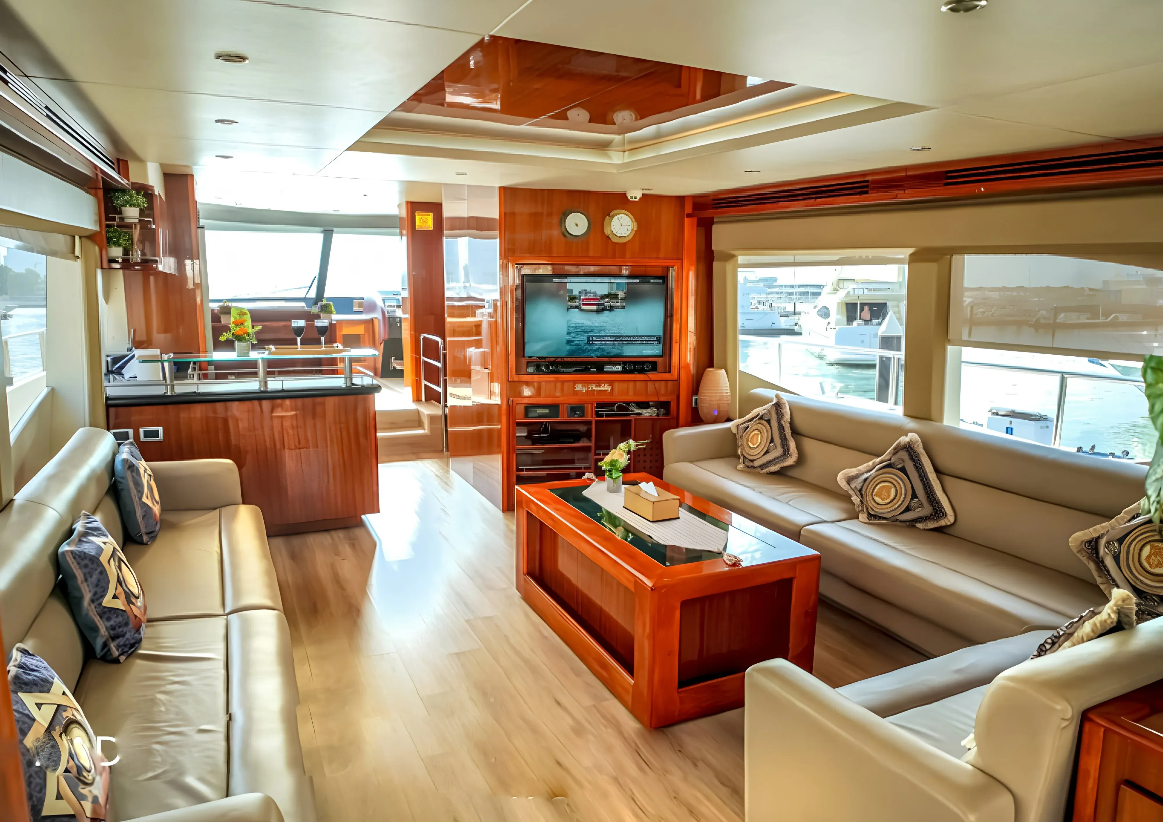 The yacht’s interior blends modern sophistication with timeless luxury, featuring premium materials such as marble, fine leather, and polished wood. For business travelers, the onboard office is equipped with high-speed internet and video conferencing facilities.