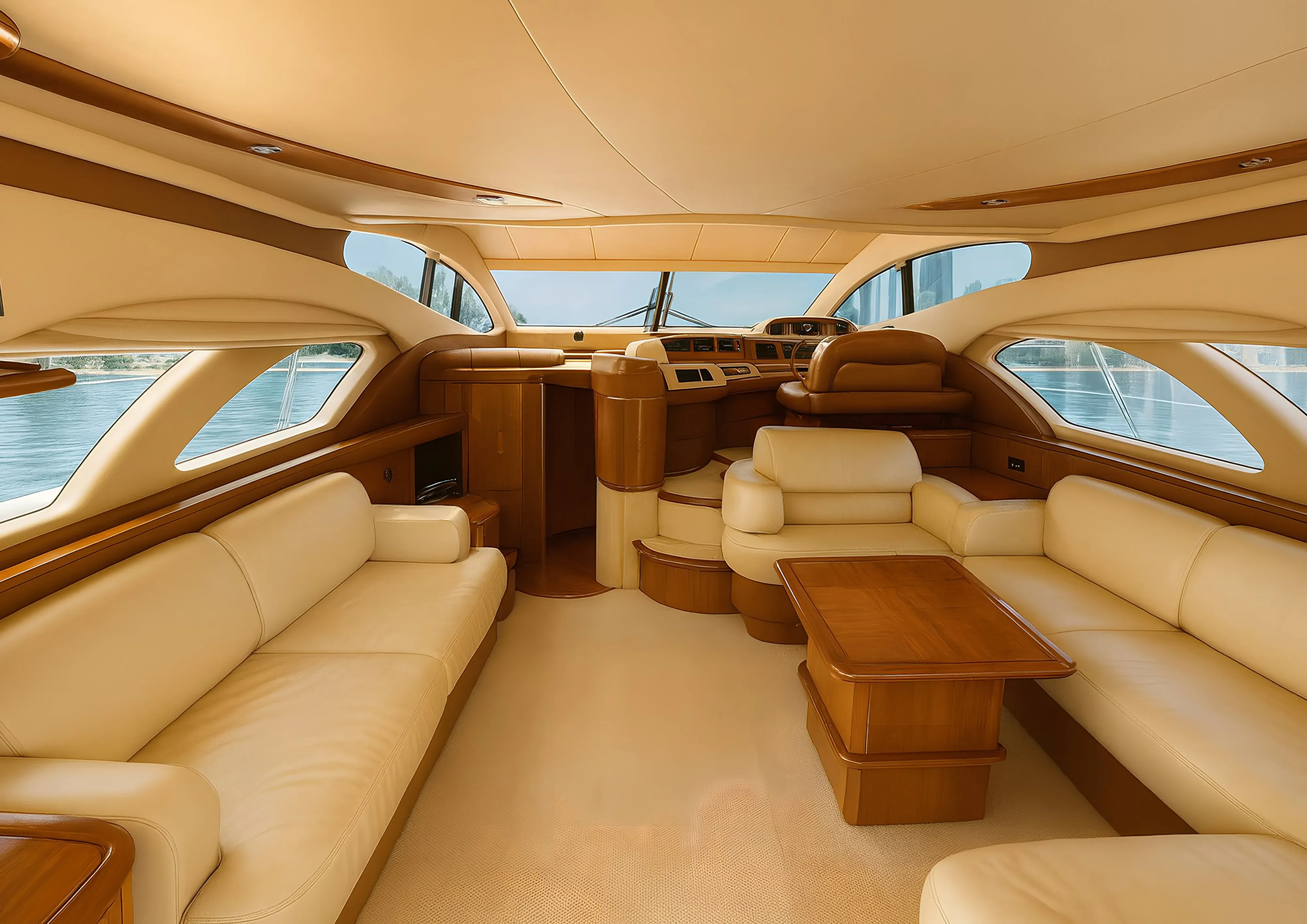 For those seeking sun-filled adventures, the Azimut 50 offers a generous bathing platform and an impressive flybridge. Among its standout features is the hydraulic bathing platform at the stern, rising and lowering to create the feeling of a private beach. Inside the main salon, the uniquely designed C-shaped sofa extends into a double bed, complete with discreet storage compartments underneath.