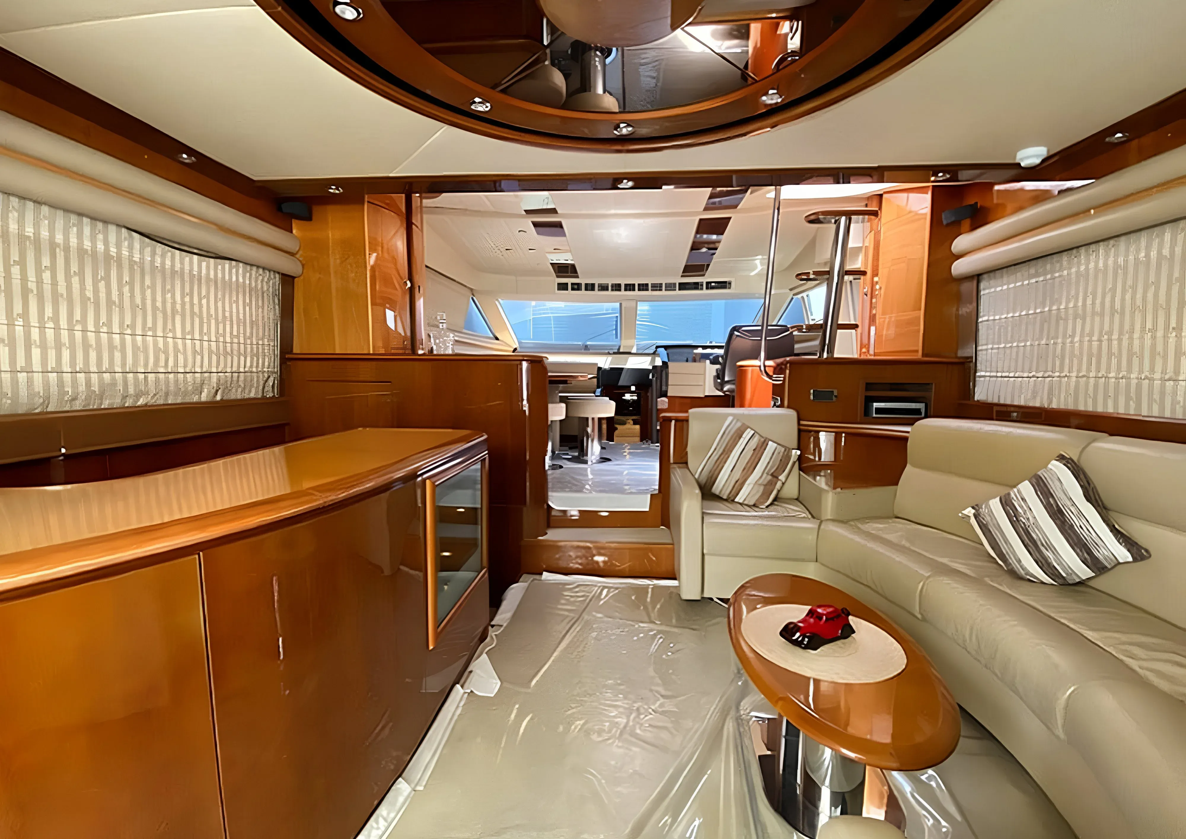 The main salon welcomes guests with modern furnishings, floor-to-ceiling windows offering panoramic ocean views, and cutting-edge entertainment systems. Adjacent to the salon, the formal dining area provides the perfect setting for enjoying exquisite meals crafted by the onboard chef.