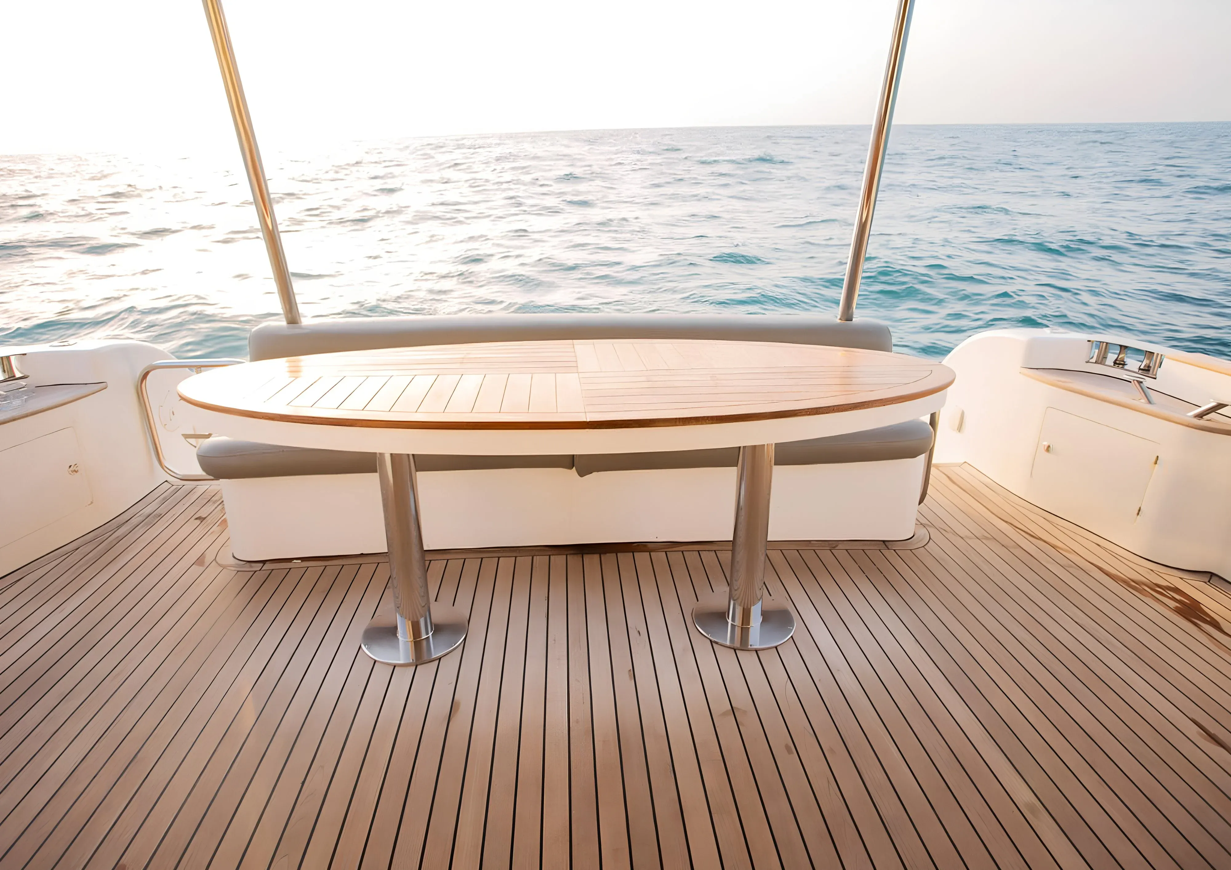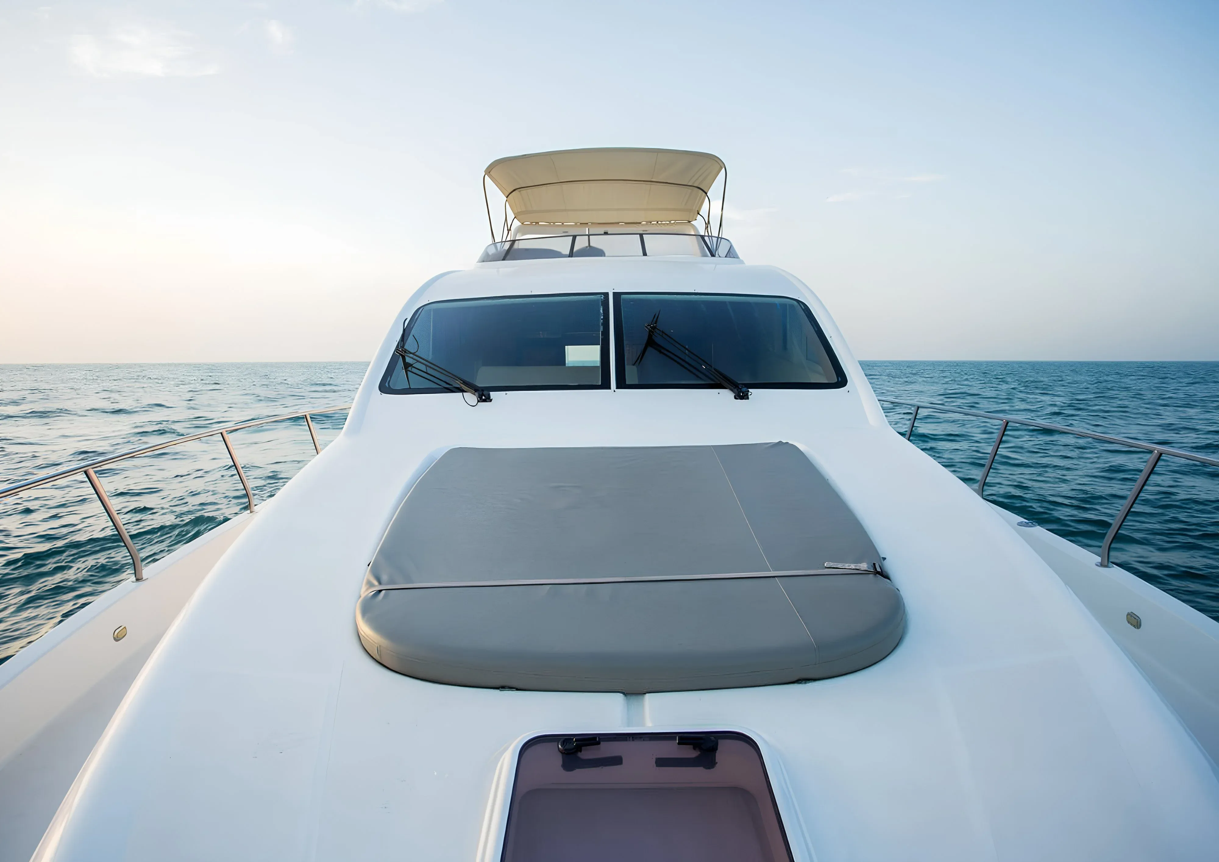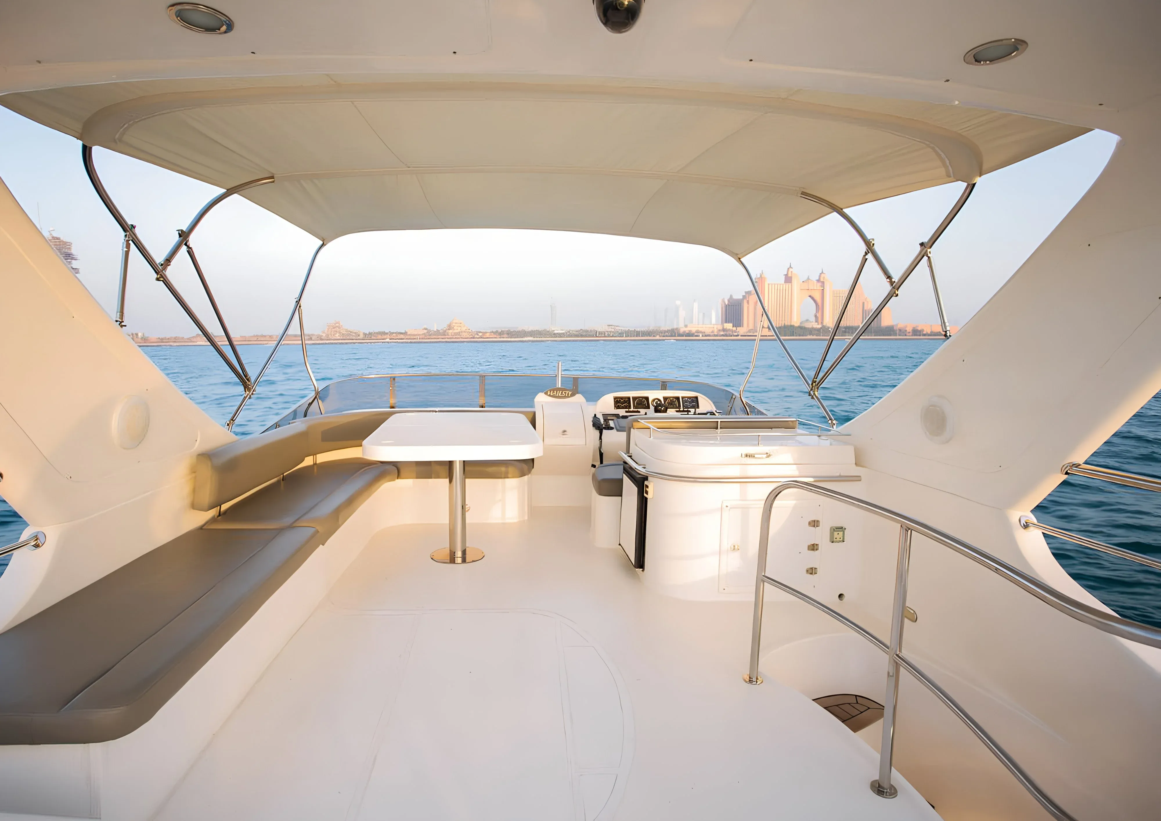 Stepping outside, the Majesty 66 impresses with multiple outdoor lounging areas that bring the Dubai skyline to life. The expansive flybridge offers panoramic views and is one of the best spots for relaxing in the sun, hosting small gatherings, or simply enjoying the sea breeze as you cruise. The front deck provides another comfortable area for sunbathing or taking photos, while the rear deck is perfect for casual dining or enjoying a peaceful evening on the water. Many charters include amenities such as air-conditioning throughout the yacht, a sound system for music, and a professional captain and crew to take care of every detail. Guests are often allowed to bring their own food, and some charters offer BBQ facilities for those who want to enjoy a fresh grill on deck.