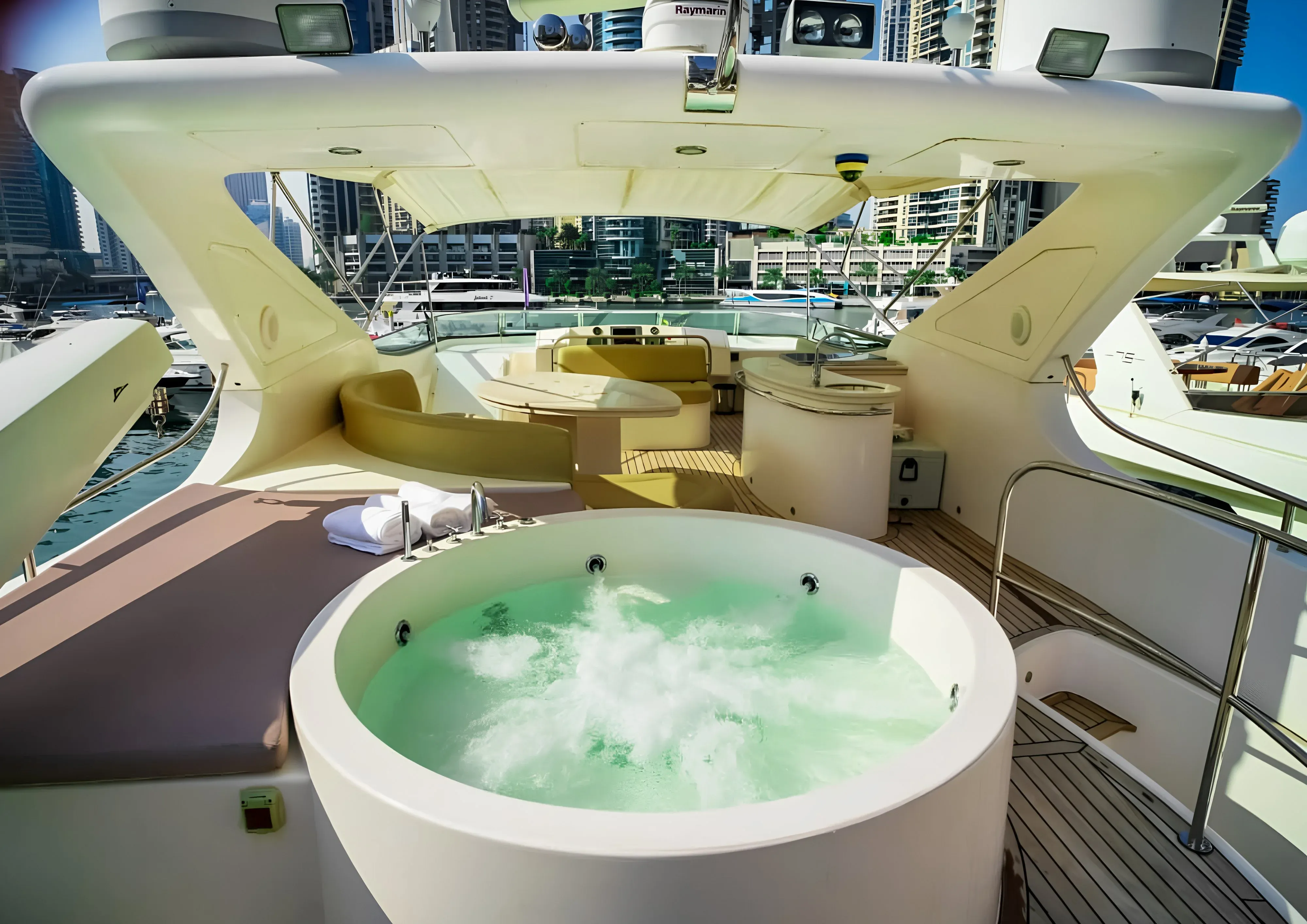 A highlight of the Majesty is its flybridge, an entertainer’s paradise complete with a wet bar, ample lounge seating, and a luxurious Jacuzzi overlooking the open waters. For sun lovers, the foredeck provides oversized sun pads and a secluded seating area, perfect for soaking in the sunshine or enjoying peaceful evenings under the stars.